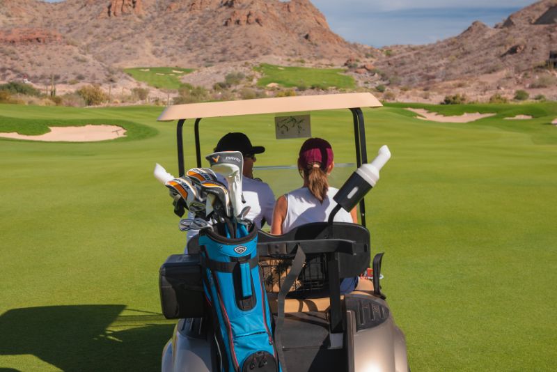 Jueguen juntos en el pintoresco campo de golf TPC Danzante Bay, rodeados de impresionantes vistas al mar y exuberante vegetación.
