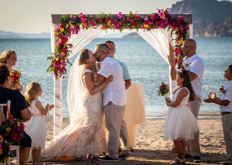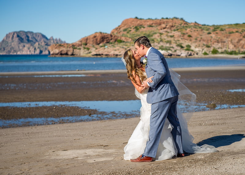 Cuando estés planeando una boda destino en Loreto, no tendrás que preocuparte por decorar demasiado porque con el mar y las montañas de alrededor proveen escenarios deslumbrantes para tu ceremonia -a pesar de que nadie podrá apartar la vista de ti y de tu amado-. Para esta pareja, sus fotos en la playa estarán colgando de sus paredes durante años, conservando los recuerdos de su boda y el tiempo vivido con la familia en la belleza natural de Loreto. Mientras planificas tu día, considera un momento entre la ceremonia y la recepción para tomarse algunas fotos juntos mientras la puesta de sol colorea el cielo con su luz dorada.