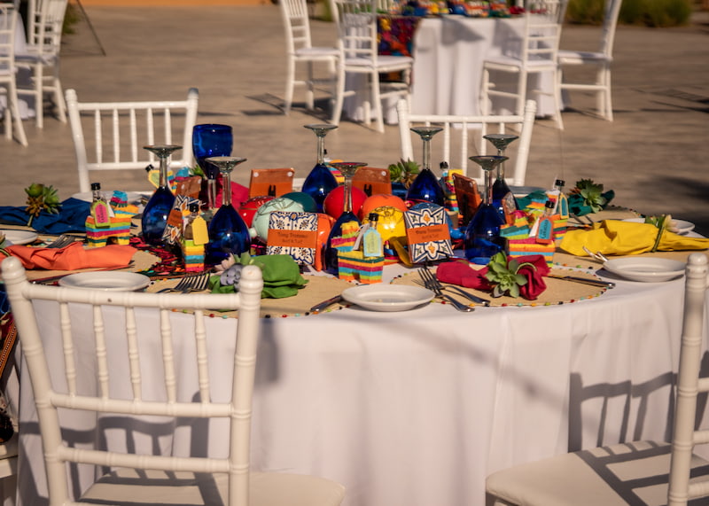 Convierte tu recepción en una fiesta con unos toques mexicanos mágicos incorporados a tus mesas y a la decoración. Capturar fotos de estos pequeños detalles ayuda a contar la historia de tu boda destino en Loreto, y debido a que la mayoría de las parejas se encuentran ocupadas disfrutando de su amor y gozando tiempo con sus invitados, más adelante querrás estas fotos para recordar estos hermosos momentos. Con la ayuda de tu coordinador de bodas, puedes tener mesas totalmente festivas que capturen la vibra y el estilo de Loreto. Los colores brillantes y la diversa paleta de colores de tonos alegres ayudarán a que comience la fiesta.