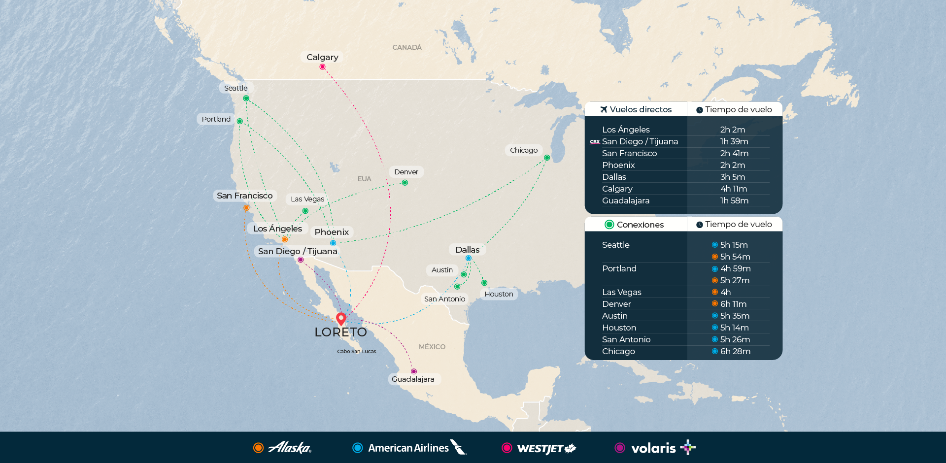 Loreto está aproximadamente a 480 km (unas 6–7 horas por carretera) al norte de Los Cabos. No hay vuelos directos frecuentes entre ambos, por lo que la mayoría viaja por carretera o con escalas.
