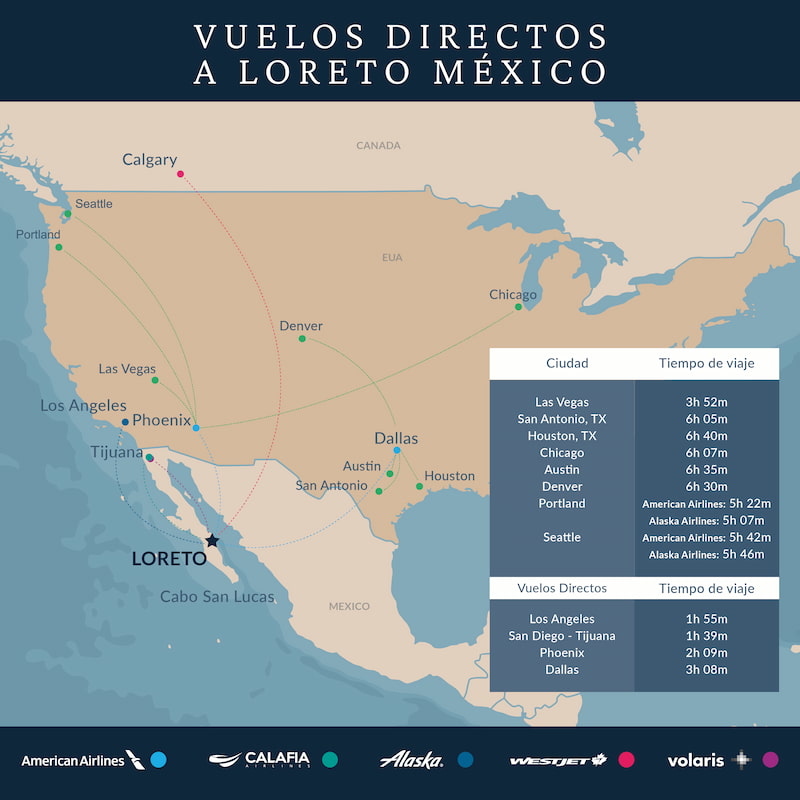 La lista de las aerolíneas que ofrecen servicio en Loreto crece constantemente a medida que más viajeros se enteran de la espectacular belleza natural, del golf de clase mundial y de los deliciosos mariscos en Loreto. Algunas de las opciones más populares son Alaska Airlines, American Airlines y Westjet, y también hay vuelos nacionales dentro de México con Calafia Airlines y Volaris. Al hacer tus planes de viaje, también puedes optar por cruzar la frontera en San Diego y tomar un vuelo rápido desde Tijuana.