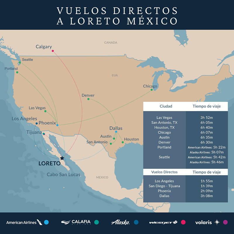 Llegar ahí es increíblemente sencillo, porque Loreto cuenta con su propio aeropuerto internacional. El Aeropuerto Internacional de Loreto es un pequeño y moderno aeropuerto que constantemente ofrece vuelos internacionales a Los Ángeles, Dallas, Phoenix y a Calgary, así como vuelos nacionales a Tijuana y La Paz. Volar es la forma más rápida y fácil de llegar a Loreto.