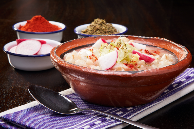 Este tradicional caldo mexicano se elabora con maíz pozolero, carne de cerdo y una base de chiles y especias. Se sirve con lechuga, rábanos, orégano, cebolla y limón. El pozole es una receta ancestral que forma parte fundamental de la gastronomía mexicana y de muchas fiestas familiares.