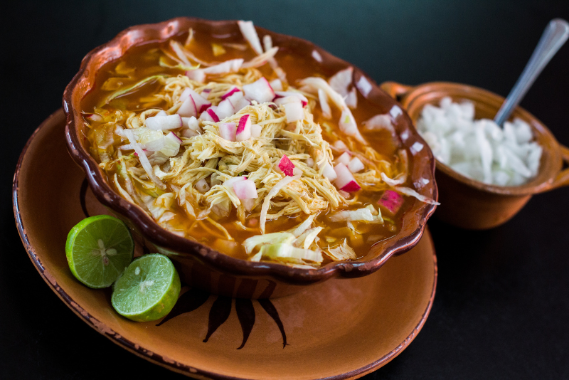 1. Pozole - Sopa espesa hecha con maíz cacahuazintle y carne (cerdo o pollo), adornada con rábanos, lechuga y limón. Es reconfortante y abundante.