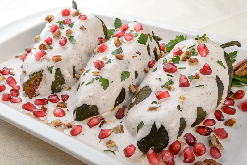 4. Chiles en Nogada - Un platillo festivo que presenta chiles poblanos rellenos de picadillo (una mezcla de carne molida, frutas y especias), cubiertos con una salsa de nuez y adornados con granada.