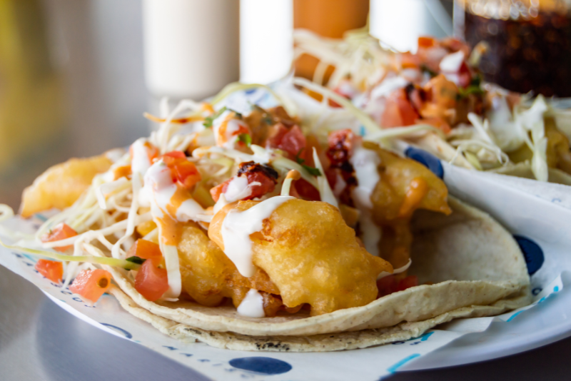 4. Tacos de Pescado - Tacos de pescado, ya sea a la parrilla o frito, coronados con col rallada y salsa cremosa.