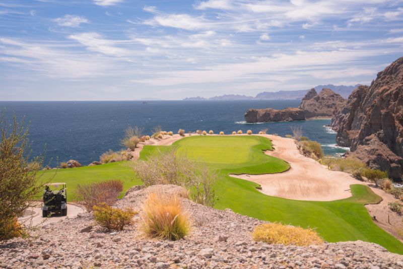Uno de los aspectos más emblemáticos del campo es el hoyo 17, un par 3 construido sobre un acantilado, donde los golfistas golpean la bola sobre una caída dramática con el Mar de Cortés como telón de fondo. Este hoyo no solo pone a prueba la destreza, sino que también ofrece un espectáculo visual inolvidable.