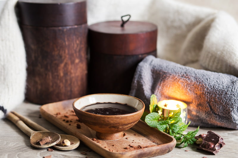 Exfoliante Corporal Chocolate Menta: Borra el daño de los días bajo el sol con esta mezcla de gránulos de chocolate blanco con un exótico suero de menta. Quitar la piel muerta revela una piel fresca y reduce las líneas de expresión.